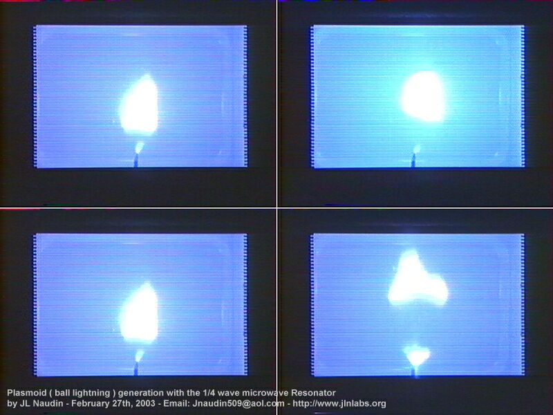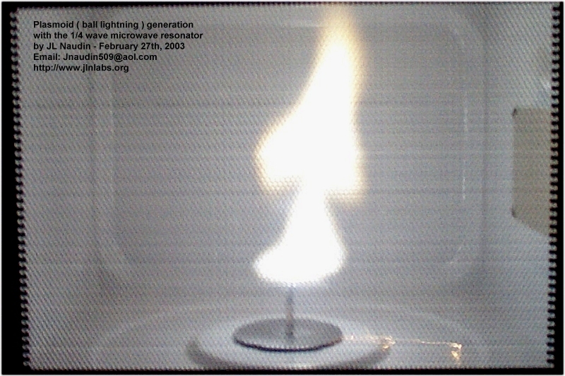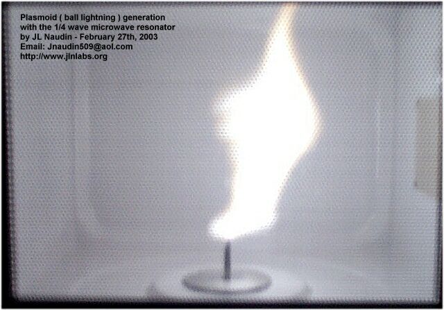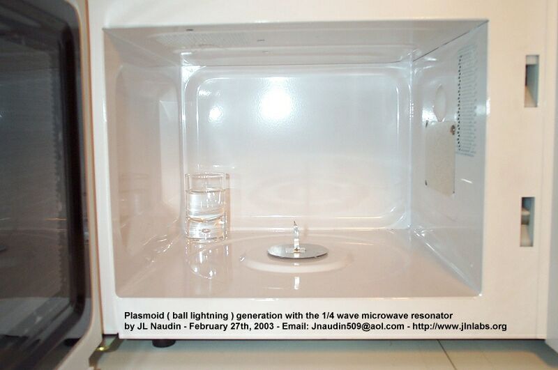 The purpose of this test is to build a plasmoid ( a ball lightning ) with a microwave resonator placed in a microwave oven. A microwave oven uses a magnetron as microwave source, its working frequency is 2.45 GHz. A magnetron is compact, has a light weight ( compared to a HV transformer with the same output power ) and it is a high power device. It is able to produce a great amount of power in a small volume most particularly in a plasmoid. A plasmoid is a great source of ions and can be very useful for EHD, MHD and Electrokinetic devices such as the Lifter....