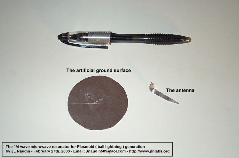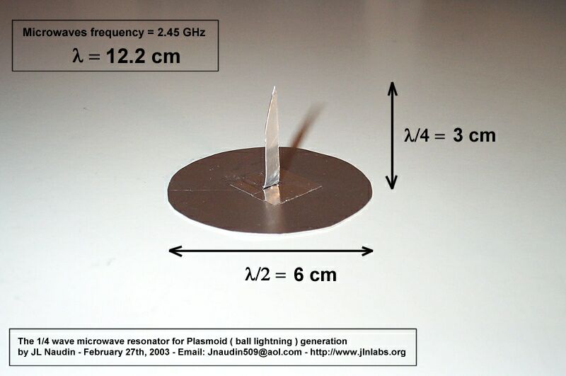 This experiment uses a microwave resonator composed with a small quater wave antenna mounted on an artificial ground surface. The frequency of the magnetron is 2.45 GHz, its wave length is l = 12.2 cm, this gives the height of the 1/4 wave microwave antenna : l/4 = 3 cm and the ground base diameter : l/2 = 6 cm.